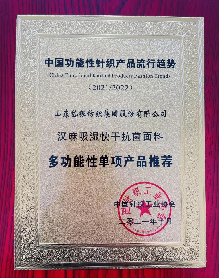近日,由中国针织工业协会和中国国际贸易促进委员会纺织行业分会举办的中国功能性针织产品流行趋势发布活动于国家会展中心(上海)圆满落下帷幕。tyc5997太阳集团首页纺织服装研究院参评的“汉麻吸湿快干抗菌面料”获得中国功能性针织产品流行趋势多功能性单项产品推荐。