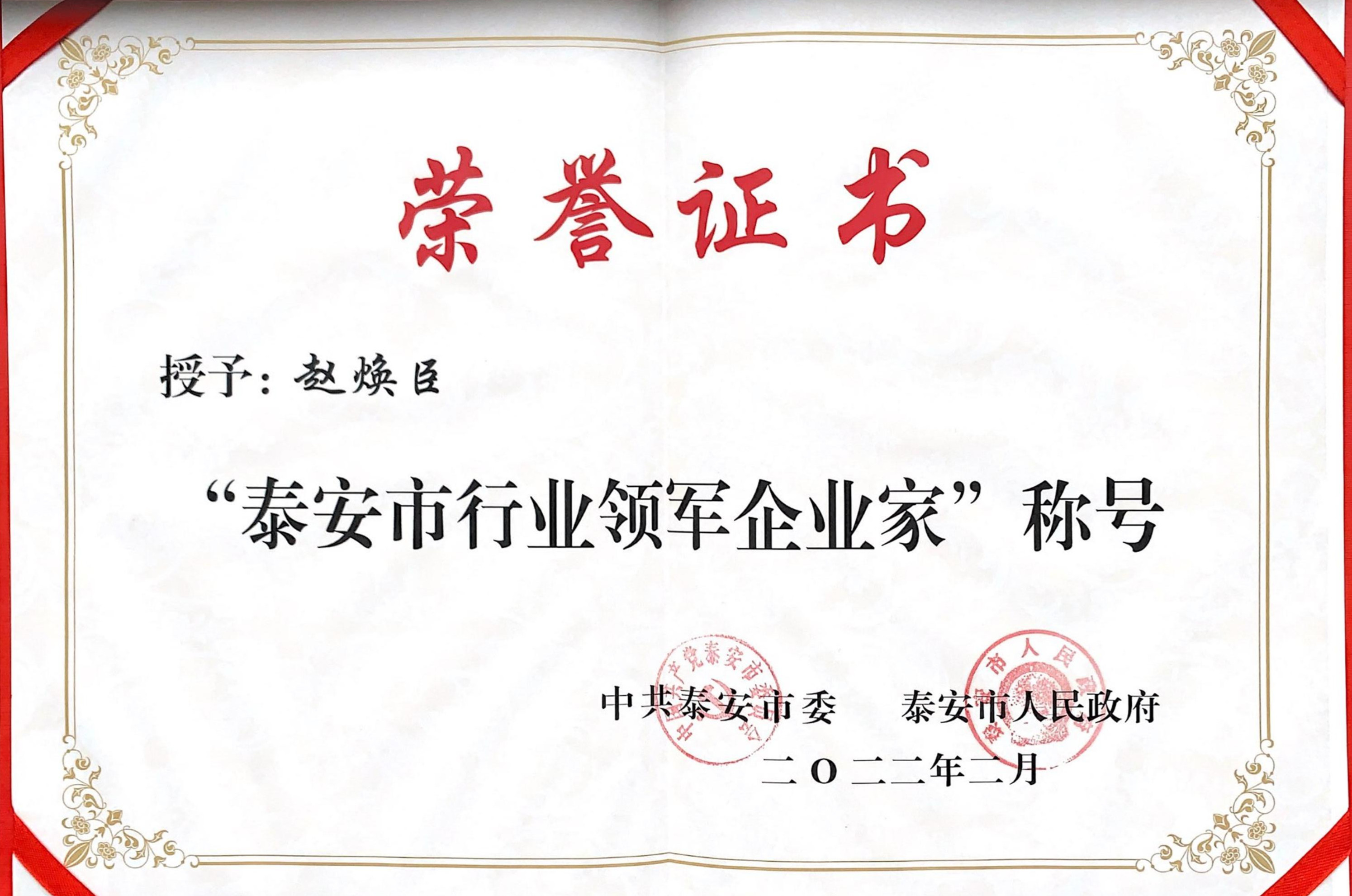 集团董事长赵焕臣荣获“泰安市行业领军企业家”荣誉称号